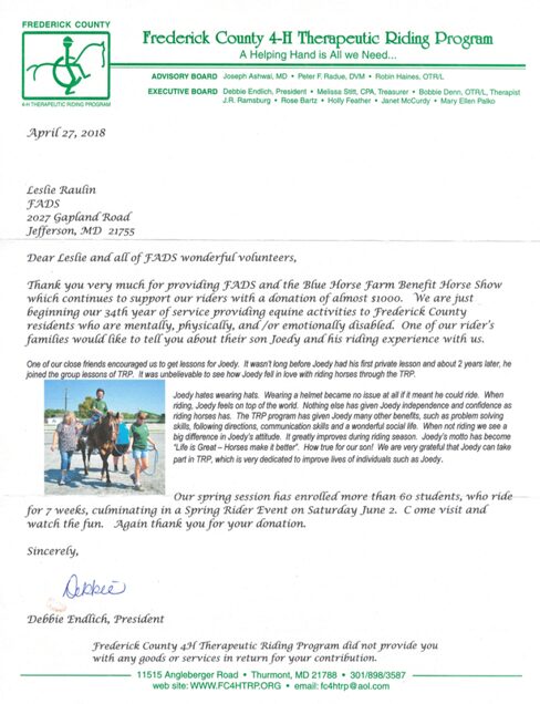 The Frederick County 4-H Therapeutic Riding Program (click here to open the web site) is the beneficiary of the April 22, 2018 FADS at Blue Horse Farm show. Below is a letter received from the program President, Debbie Endlich, which includes information from the parents of a program participant, Joedy. Glad to know the funds from FADS shows continue to help the community.