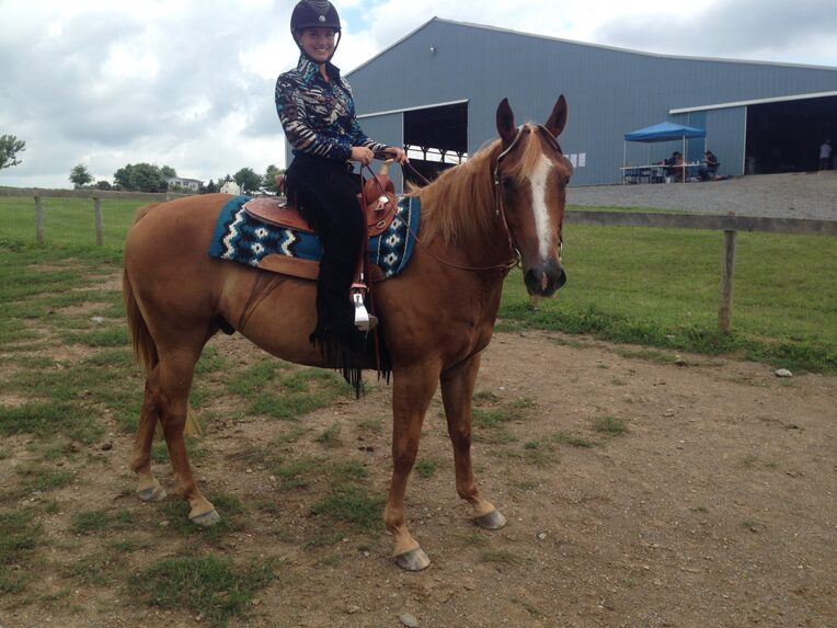 Erin Hudson and L’il Red at the FADS @ By Chance Farm show on July 23, 2017. Note the fancy sparkly tack and riding outfit. Also note the safety helmet with the western tack. Yay!