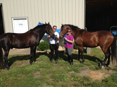 Krista Martinko with Mythic Juma and Jen Drescher with Blue and White Raven enjoying their FADS blue ribbons earned in Fourth Level TOC (Test 1) and FEI TOC (Intermediaire I), respectively. Great rides!