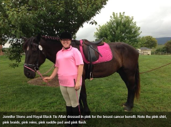 Jennifer Stone and Royal Black Tie dressed in pink for the breast cancer benefit. Note the pink shirt, pink braids, pink reins, pink saddle pad, and pink flash!