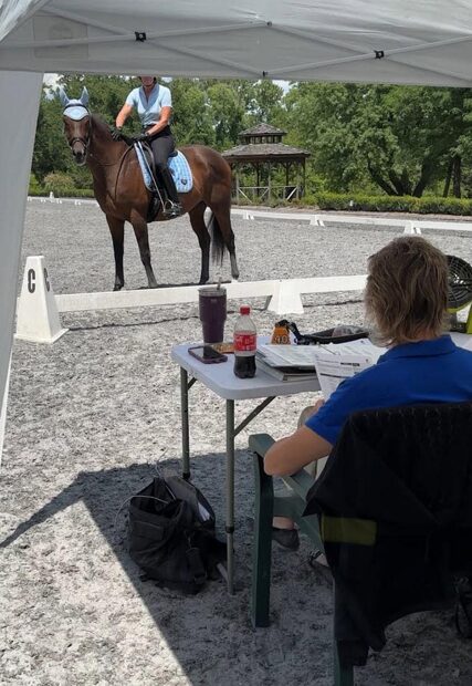 Mariea Sabate on her horse Principal Bob getting feedback from Donna Gatchel (L) at FADS @ Wyndham Oaks on July 27, 2024. They rode Intro C (4th) and Training 1 (1st). Congratulations!
