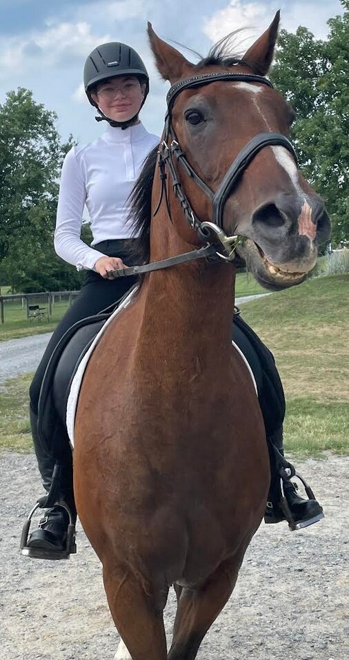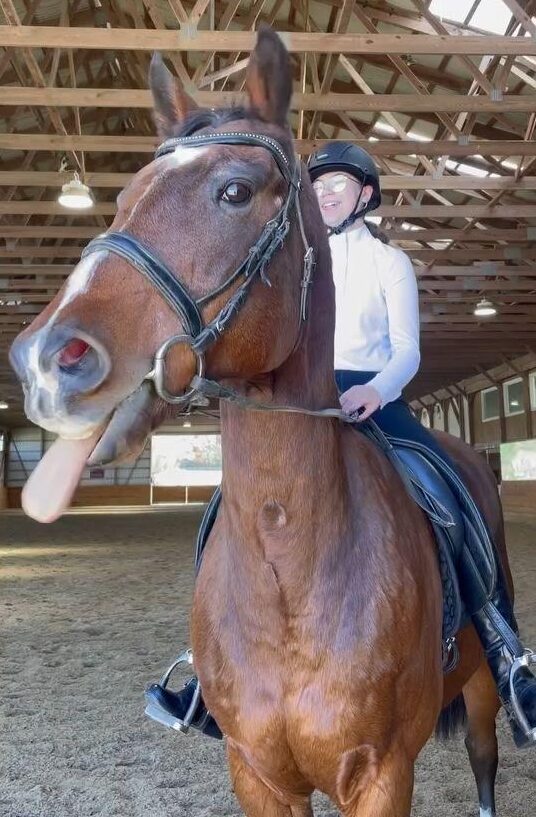 Skylar Shaffer riding Rodeo at the August 2025 FADS @ By Chance Farm show. Skylar is having fun; Rodeo is saying “OK, we rode a great test and I was very good. Now let’s get that post-ride treat!”