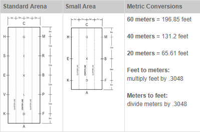 Dressage tests are ridden in an arena that is either 20m x 60m (standard or large arena) or 20m x 40m (small arena). They have letters that that mark certain points of the arena. The letters determine the location of dressage test movements. For most shows, one judge is located at letter C. In some shows, there are multiple judges at multiple letters. (USDF)