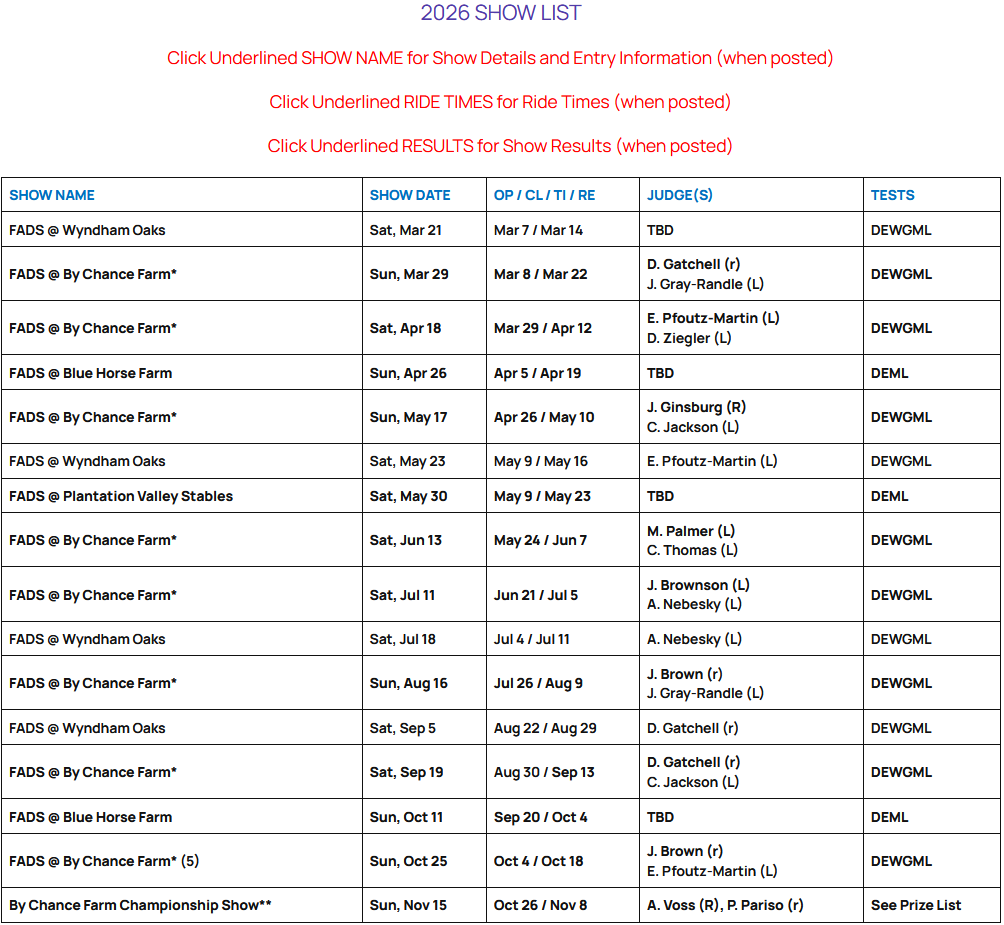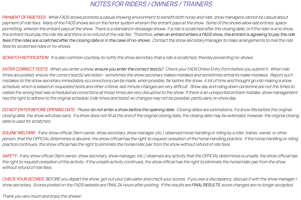 Most FADS shows can take a limited number of rides. For example, if a farm has one show arena, when a full day of rides has been entered in the show, no more rides can be accepted, and the show is closed. This can occur BEFORE the closing date. Therefore, a show might close before the closing date. If you really want to participate in the show, it is best to NOT wait for the closing date to enter the show.