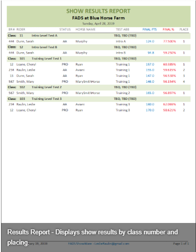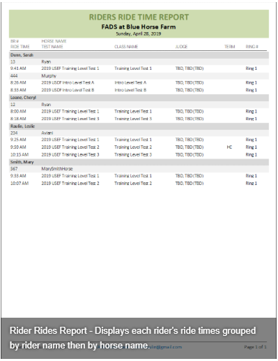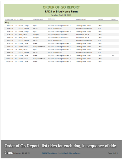 - Reports for Order of Go, Show Class List, and Rider Ride Times