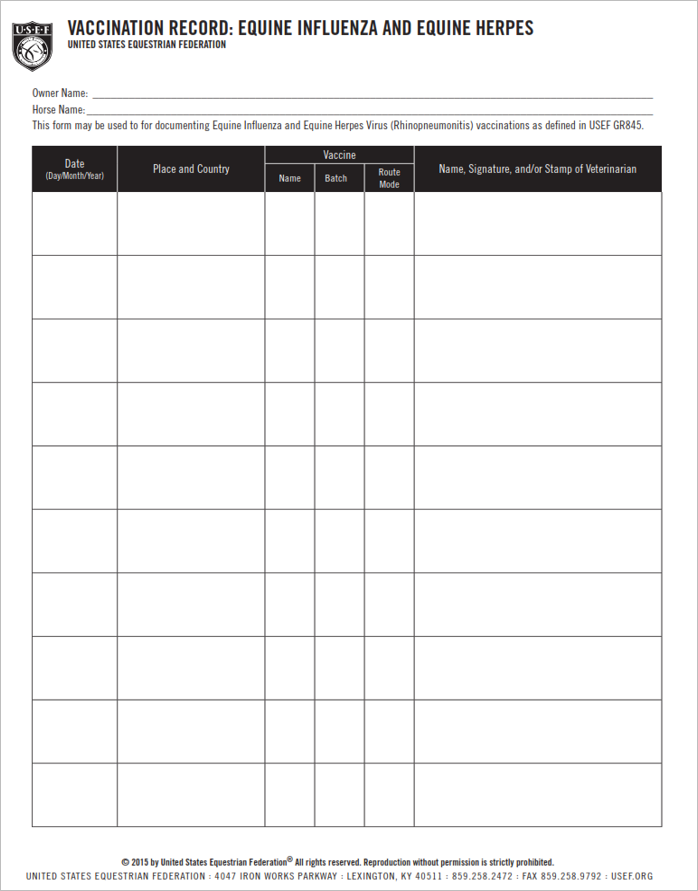 USEF requires vaccination for Equine Influenza Virus and Equine Herpes Virus (Rhino-pneumonitis) within six months of the show date (USEF GR844).  Proof can be the USEF Vaccination Form (as on the right), a letter from the vet, an invoice from the vet, etc.
