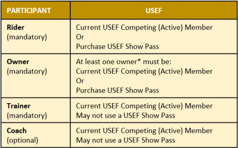 • Rider and Owner must be a USEF Active Member or purchase a USEF Show Pass for $85 (as of December 12, 2025; one pass per show/year).