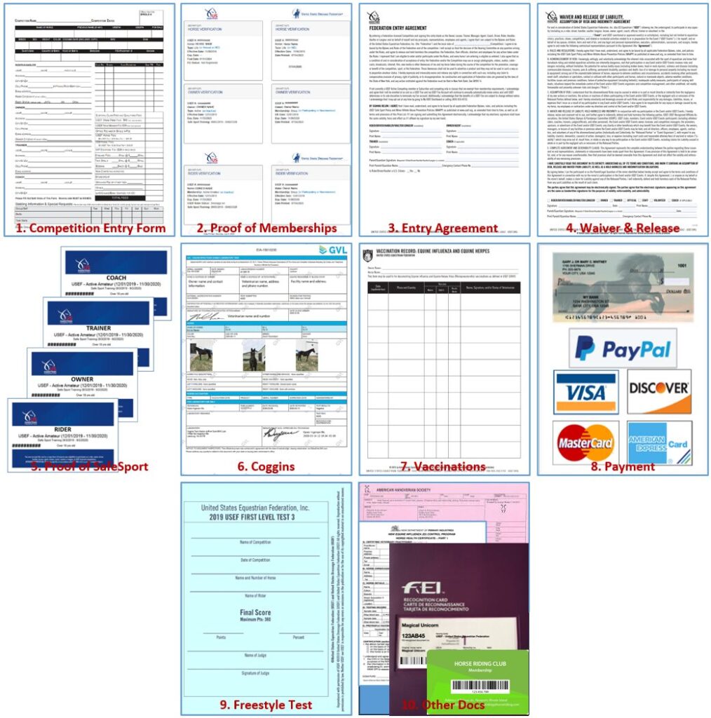 10. Other Documents (some shows may require additional documents such as venue waiver form, breed papers, health certificate, passport, proof of a local membership, proof of pony measurement, etc.; see prize list)