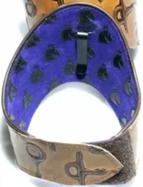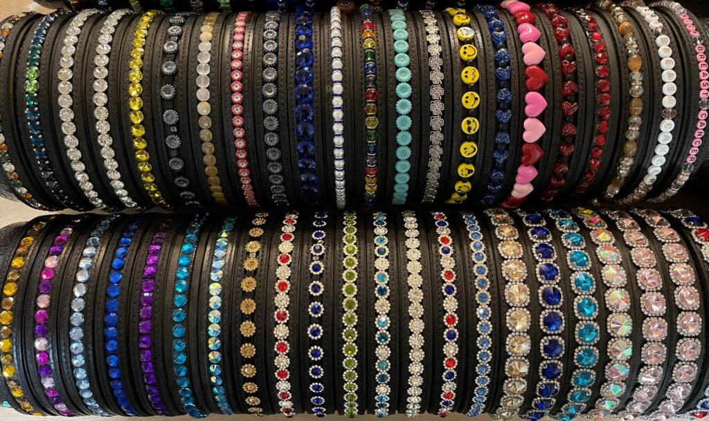 You can also get a bling brow band through Brow Bands for Charities (click here). Buy a brow band and donate to a charity. Cost for a 1″ biothane brow band is a minimum of $45 ($15 to cover materials, $30 or more for the charity; stock colors are black and brown, other colors are available with custom orders and a bit more money). Cost for a black 1″ leather brow band is a minimum of $65 ($35 to cover materials and $30 or more for the charity – limited available). Buy from stock or order a custom design where you choose size, design, and colors. The photo below shows some of the designs and colors. Also available are custom-made belts with bling that matches brow bands.