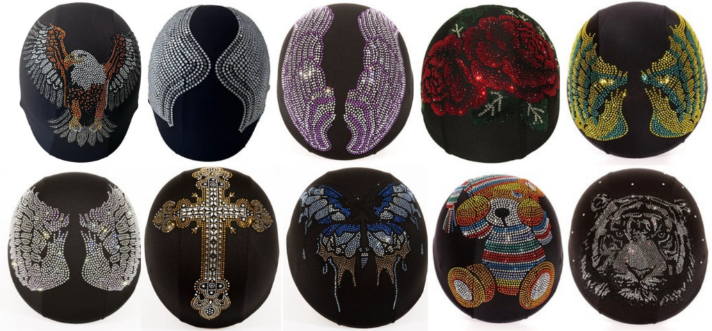 A company called Pinbusdesigner sells helmet covers with bling (click here). The website shows 72 different designs for about $35 each, some with free shipping. They are also sold on Etsy. The helmet covers do not have a section for the helmet brim; however, I have fond they fit fine on my riding helmets. The photos below show some of their very creative 72 designs.